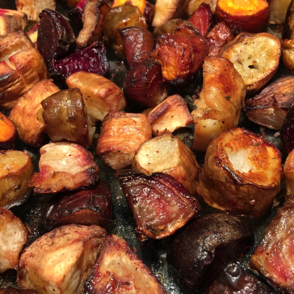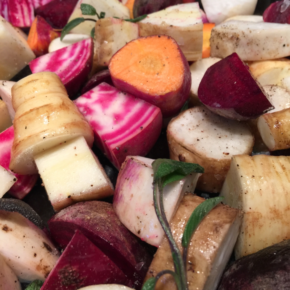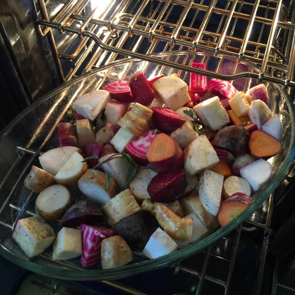 To accompany the halibut, I roasted a variety of root vegetables (potatoes, turnips, carrots, Jerusalem artichokes, and candy-cane beets ) in coconut oil, salt, pepper and added some fresh sage. The veggies were a great earthy combo with the baked halibut. Just remember to put them in the oven at least 45 minutes to an hour before you bake the fish.