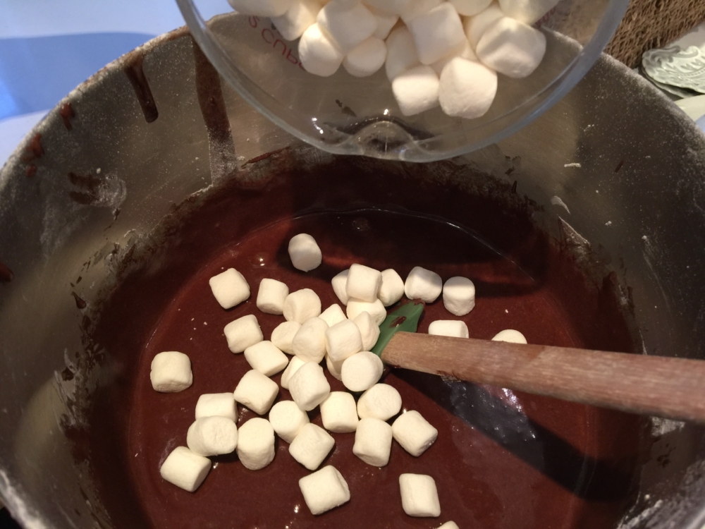 Melt butter and chocolate over a double boiler or melt in microwave. Use a mixer to beat eggs, sugar and vanilla and then add melted chocolate and butter mixture. Once combined, add flour, salt and baking powder. Finally, stir in marshmallows. Pour batter into a 9 x 13 parchment lined pan. Bake at 350 degrees for 35 – 37 minutes. Watch it carefully, you don’t want to overbake it.