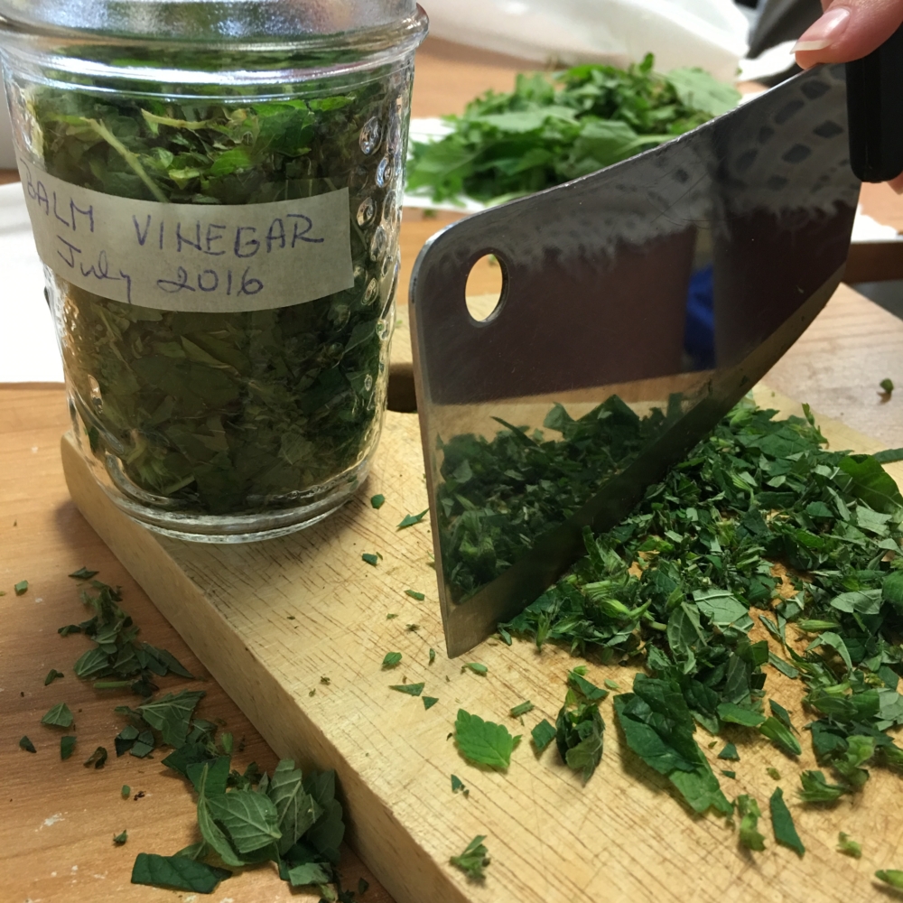 Chop fresh lemon balm, place in glass jar, add organic unpasteurized apple cider vinegar. Seal and place on kitchen counter where you will see it so you rememer to shake it once everyday for a week. After the first week, place it in a cool dark cupboard for 2 months. Then, strain the herbs out, discard them and reserve the vinegar. Enjoy the lemon balm infused apple cider vinegar on salads or whatever else you like to use vinegar for. The lemon balm adds an amazing flavour boost!