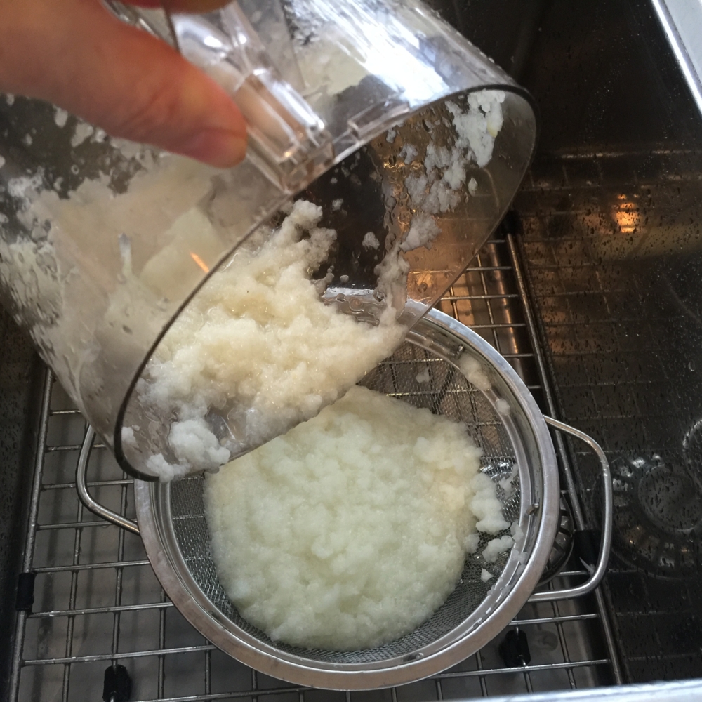 Squeeze as much water as possible from 1/2 of grated potatoes and return to processor, add 1/2 of chopped and drained onion and process with 3 or 4 very quick on and off turns.