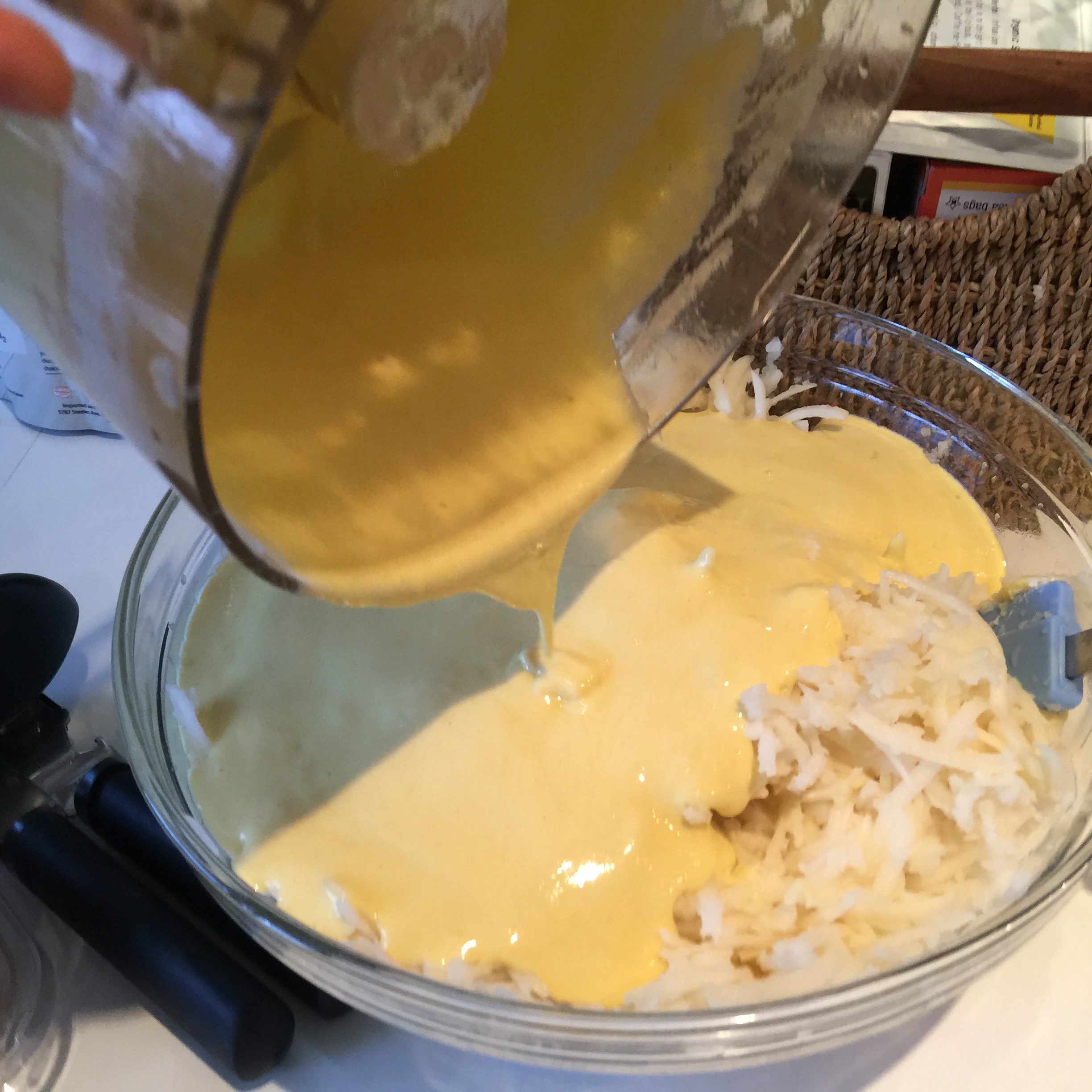 For the potatoes you need to take that regular blade out and switch it to a grater attachment so there is more texture and short strands of potato.
