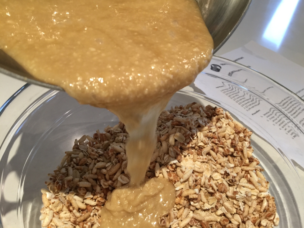 3.In a separate bowl add the rice cereal and oats and mix in the almond mixture until the grains are well coated