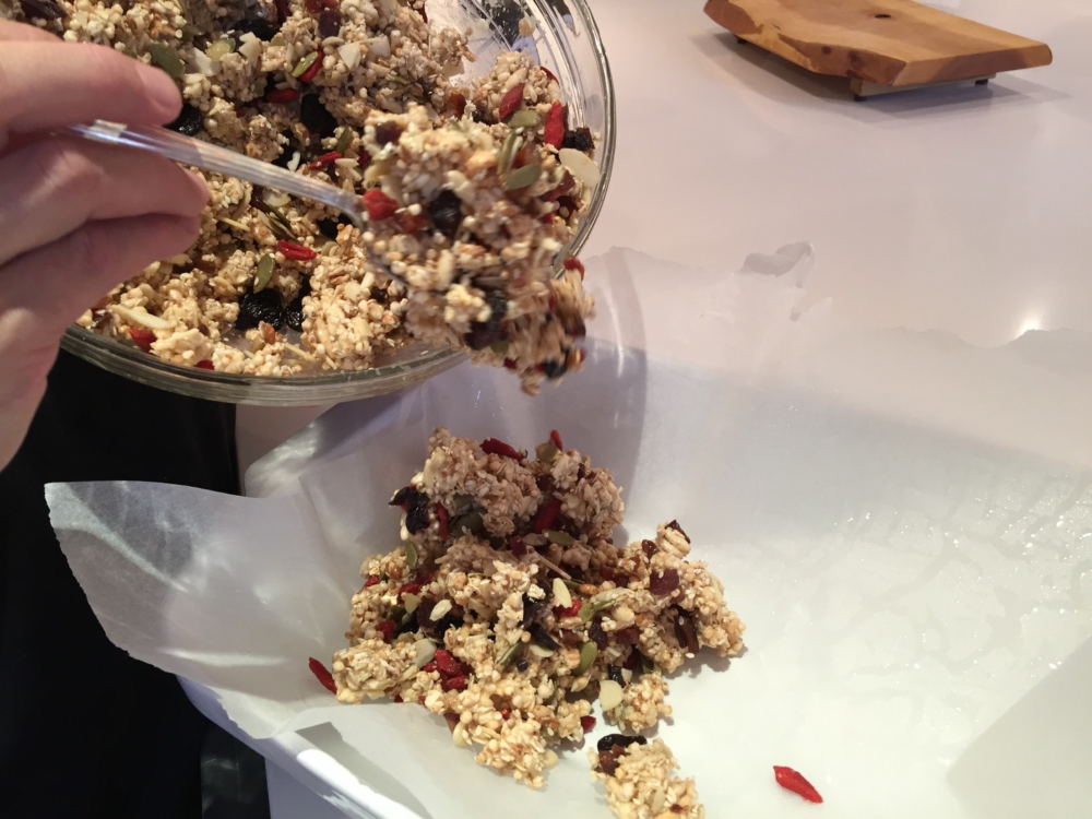 1.Spread the nuts and seeds on a larger baking pan and lightly toast in the oven on a low heat (200˚F) for about 10 minutes